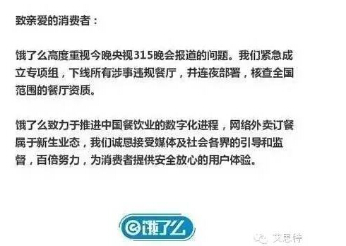 315晚会结束后,饿了么微博发布回应: