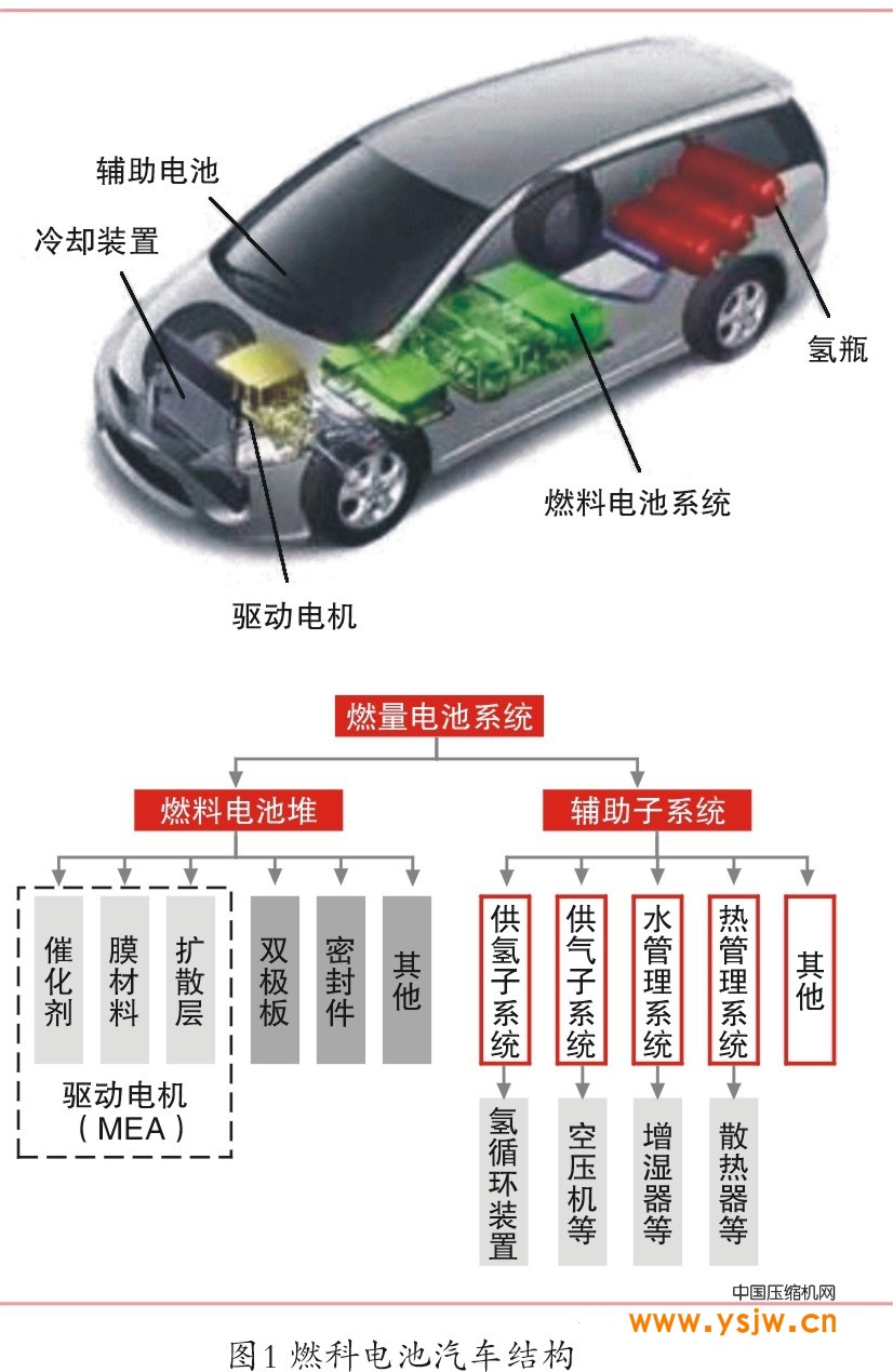 燃料电池汽车由燃料电池系统、储氢瓶、驱动电机、整车控制系统 、辅助电池系统构成。燃料电池系统占整车成本约 63%,由燃料电池堆(催化剂、双极板、质子交换膜),空气循环系统、供氢和水/热管理系统构成。燃料电池汽车的核心部件离不开空气压缩机新能源汽车发展迅速,燃料电池可能会成为空压机进入新能源汽车领域的切口。