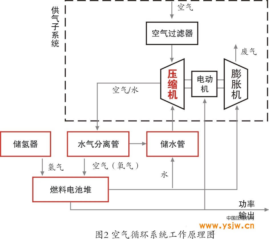 空压机会成为燃料电池的核心部件之一,空气通过压缩机增压之后,经过加湿处理送入到燃料电池反应堆,在那里和来自于氢源的氢气发生电化学反应,输出电能用于动力输出。 输入气体在消耗了部分氧气之后,压力有所下降,排出反应堆,通过分水,去雾之后,通过膨胀器从压力气体中回收部分压力能,将其转化为机械能反馈到空气压缩机,从而节省供气单元所需要的电能。